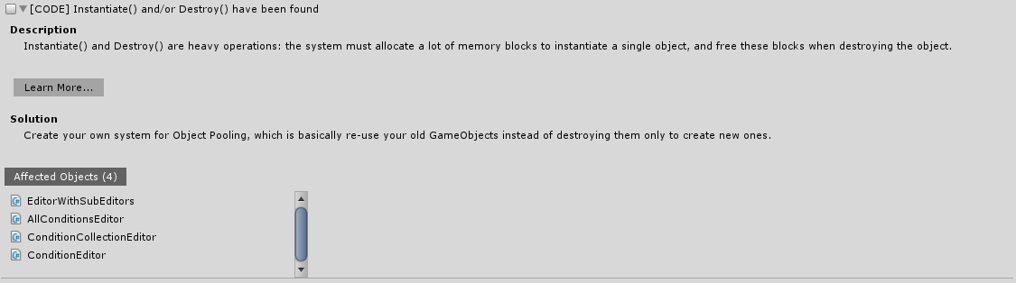 Affected Objects show which Assets/GameObjects/Folders are affected by a said problem. If many scenes are open, Affected Objects will be organized by their source scene.