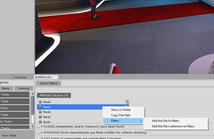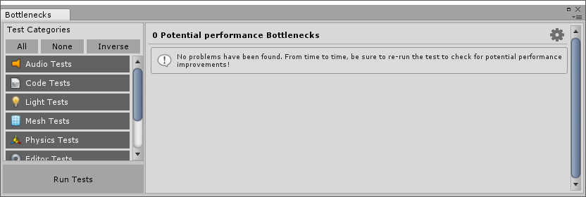 Now, if you’re opening this Window for the first time, you’ll have 0 “Potential performance Bottlenecks”. From there, press Run Tests. It should take several seconds for it to produce results. Scan time depends on your project size. The larger the project the more time it takes for scanning to finish. It’s recommended to make use of Filters and run only specific tests.