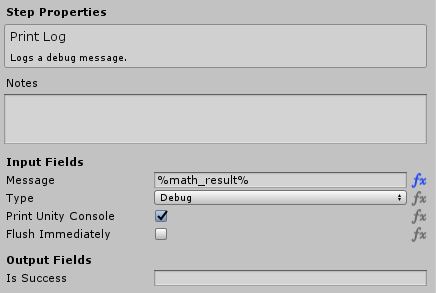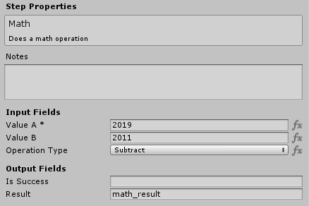 After our MathStep step runs a mathematical operation between two values the resultant value needs to be usable by other steps. This can be done by passing them to output fields, which in turn would pass them into a variable specified by us.