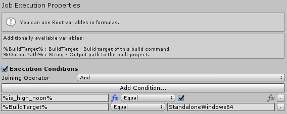 With "Execution Conditions" option enabled, this Job will be executed only if this the result condition returns "True".