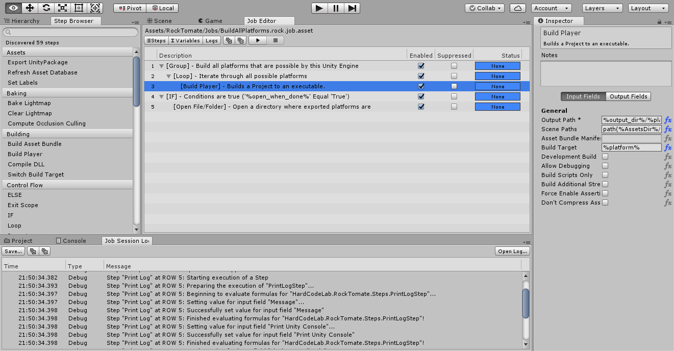 RockTomate is an editor extension that allows you to automate repetitive tasks within the Unity engine. Tasks could be as simple as creating scenes or as complicated as building a project for multiple platforms with different configurations.