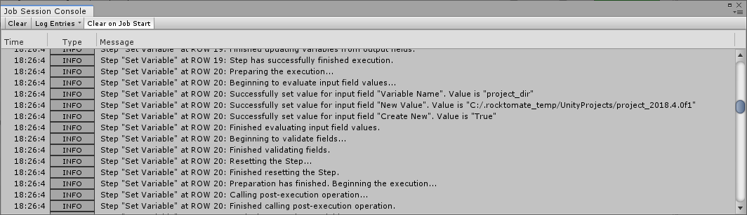 User InterfaceJob Session Console WindowOn this pageJob Session Console Window Shows all RockTomate-related log messages. Toolbar Clear Clears the console window. Does not delete log entries saved internally. Log Entries > Export...