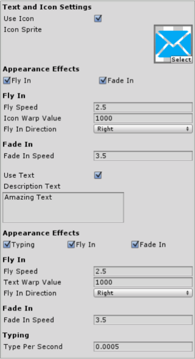 | Fly In | If set true, the icon/text will fly into the scene |
