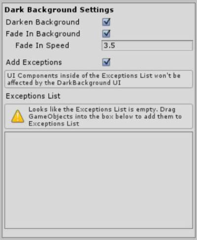 | Exceptions List | GameObjects that would be ignored by the dark background. Add them by dragging them into the window |